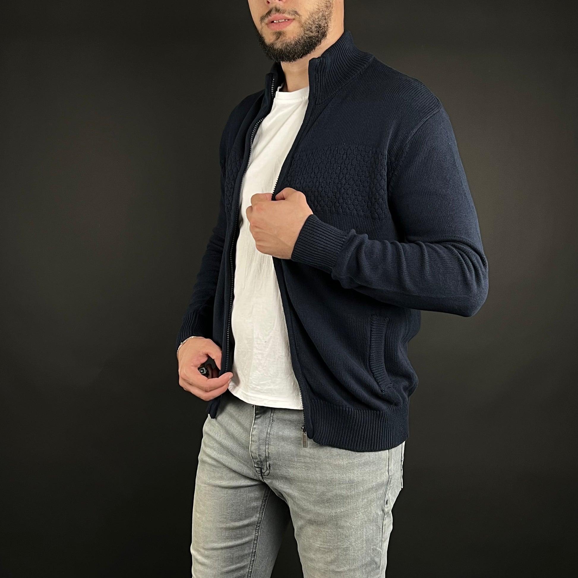 Découvrez notre gilet zip élégant en maille fine, parfait pour les saisons intermédiaires. Conçu dans une teinte bleu marine polyvalente, ce modèle allie style et confort. Le col montant zippé ajoute une touche moderne, tandis que le motif texturé sur la poitrine apporte du relief subtil. Deux poches latérales pratiques pour vos petits objets.
